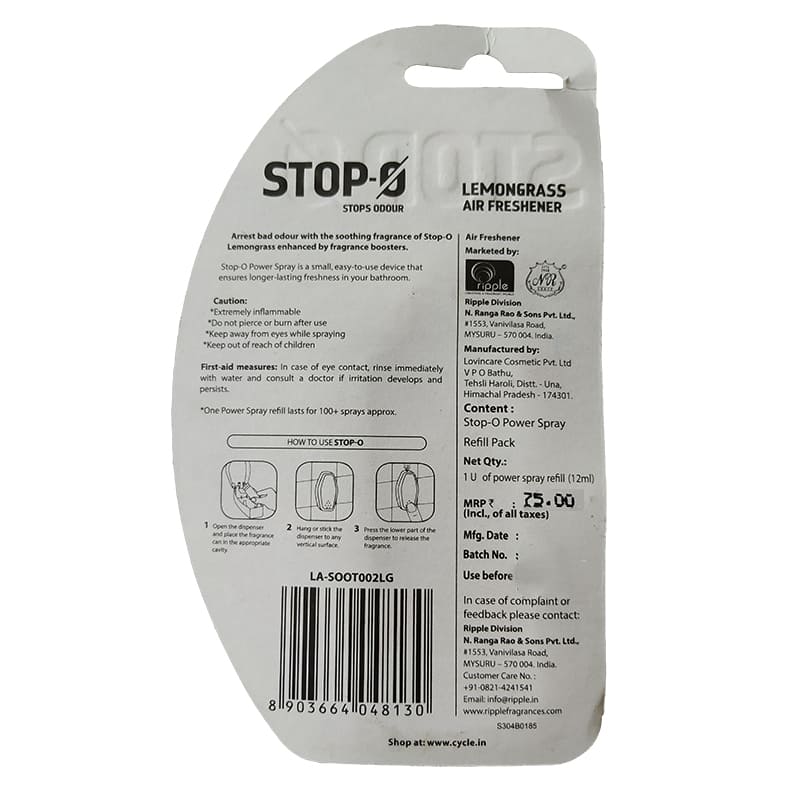 Refill pack for Stop-O Power Spray (One Touch) Instant Toilet Freshener. Arrest bad odour with the soothing fragrance of Stop-O Power Spray (One Touch) Instant Toilet Freshener. Stop-O Instant Toilet Freshener is a small, easy-to-use device that ensures longer-lasting freshness in your bathroom
