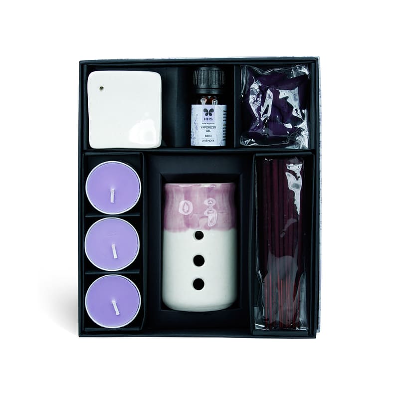 A fragrance gift set containing 20 incense sticks, 10 incense cones, 10 ml vaporizer oil, 3 tea lights, 1 vaporizer and 1incense holder.