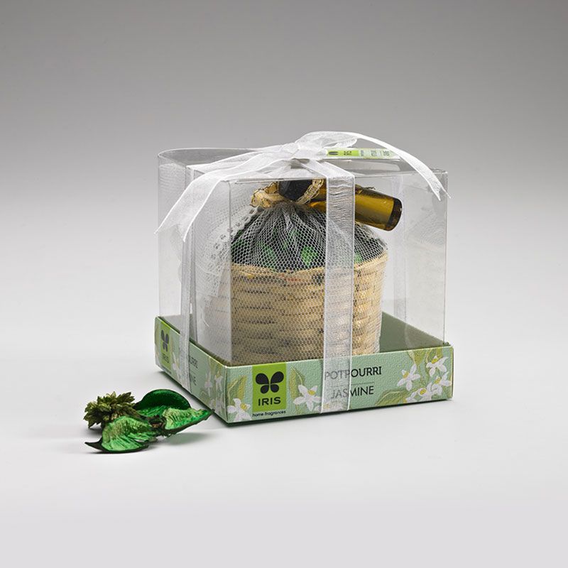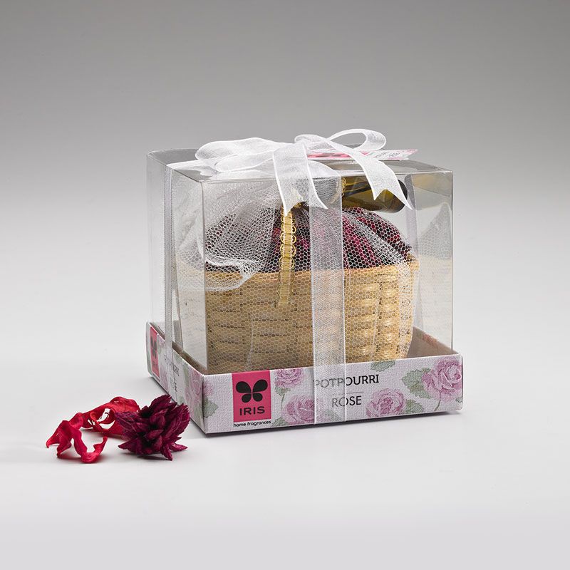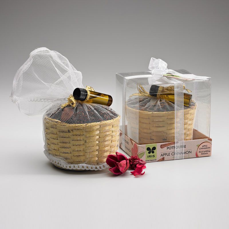 50 gms potpourri in a beautiful handcrafted cane basket encased in decorative net fabric.