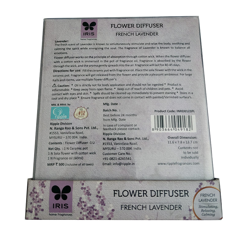 | Pack Contents | 1 No. Ceramic Pot, 1 No. Sola flower with cotton wick, 1 No. Fragrance Oil (60 ml) |