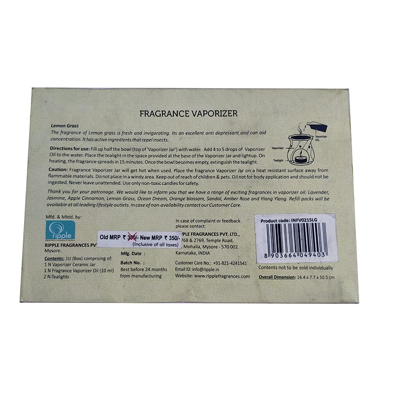 | Pack Contents | 1 No. Vaporizer Ceramic Jar, 1 No. Fragrance Vaporizer Oil (10ml), 2 Nos Tealights |