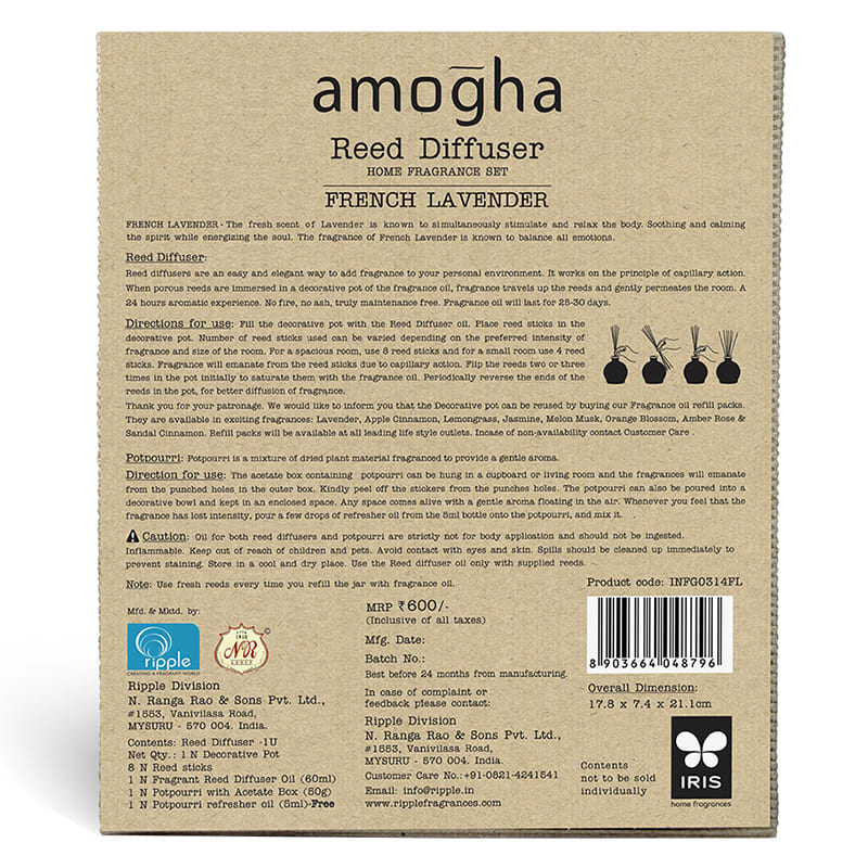 | Pack Contents | 1 No. Decorative Pot, 6 Nos Reed Sticks, 1 No. Fragrant Reed Diffuser Oil (60 ml), 1 No. Potpourri with Acetate box (50g), 1 No. Potpourri Refresher oil (5 ml) - Free |