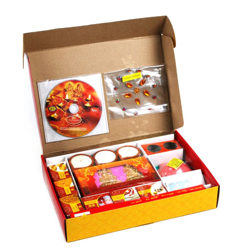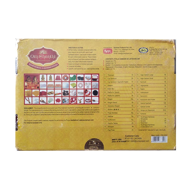 Pack ContentsThornam, Cup Sambrani, Agarbathi Holder, Deepam, Match Box, Peetha for Ganesh, Peetha for Lakshmi, Rangoli, Rangoli Stencil, Decorative Rangoli, Stickers, Pooja Akshata, Haridra, kumkuma, Gandha Tablets, Dhoopam, Pugi Phala, Ganesh Idol, Lakshmi Idol, Gejje Vastra Small, Kanchiki, Yagnapavita, Kajjala, Abharanam, Karpooram, karpooram Aarti Holder, Special Agarbathi, Special Candle, Gangajal [repacked], Kankana, Saubhagya Alankara, Mangalyaa, Bangles, Nose Stud, Saubhagya Alankara in Decorative FormGejje Vastram Large, Booklet, Audio CD.