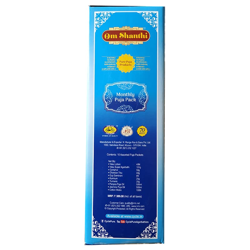 Pack ContentsVasu Loban Dhoop 40Nos, Vasu Super Agarbathi 101g, Om Shanthi Camphor 50g, Om Shanthi Pure Chandan Tika 40g, Navin Cup Sambrani 8Nos, Om Shanthi Kumkum 25g, Om Shanthi Turmeric 25g, Om Shanthi Parijata Pooja Oil 500ml, Om Shanthi Jasmine Pooja Oil 500ml, Om Shanthi Pure Cotton Wicks 100Nos.