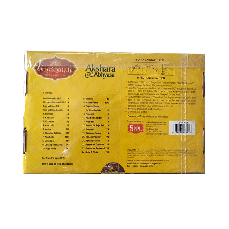 | Pack Contents | Saraswati Idol, ganga Jal, Deepam, Chandanam tablets, Peetha for Saraswathi, Pooja Bell, Thandula, Pooja Akshata, Peetha for Bell, Agarbathi, Pugli Phala, Haridra, haridra for making the symbolic Lord Ganesh, kumkuma, Vastra, Karpoora, Karpoora Aarti Plate, Ganesh Idol, Peetha for Ganesh, Kankana, Cotton Wicks for Deepam, Agarbathi Holder, Copper Vessel, Kanchuki, Rangoli Powder, Rangoli Stencil, Slate and Chalk. |