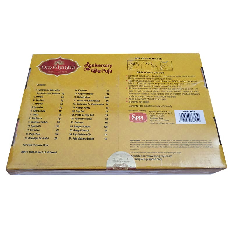 | Pack Contents | Gangajal, Deepam, ChandanamTablets, Pooja Bell, Peetha for Pooja Bell, Peetha for Pooja Bell, Pooja Akshata, Agarbathi, Agarbathi Holder, Vessel for Gangajal, Spoon, Vessel for collecting liquid offerings, Pugli Phala, Haridra, Haridra for making Symbolic Ganesha, kumkuma, Sindhoora, Vastra, Karpooram, Karpooram Holder. |
