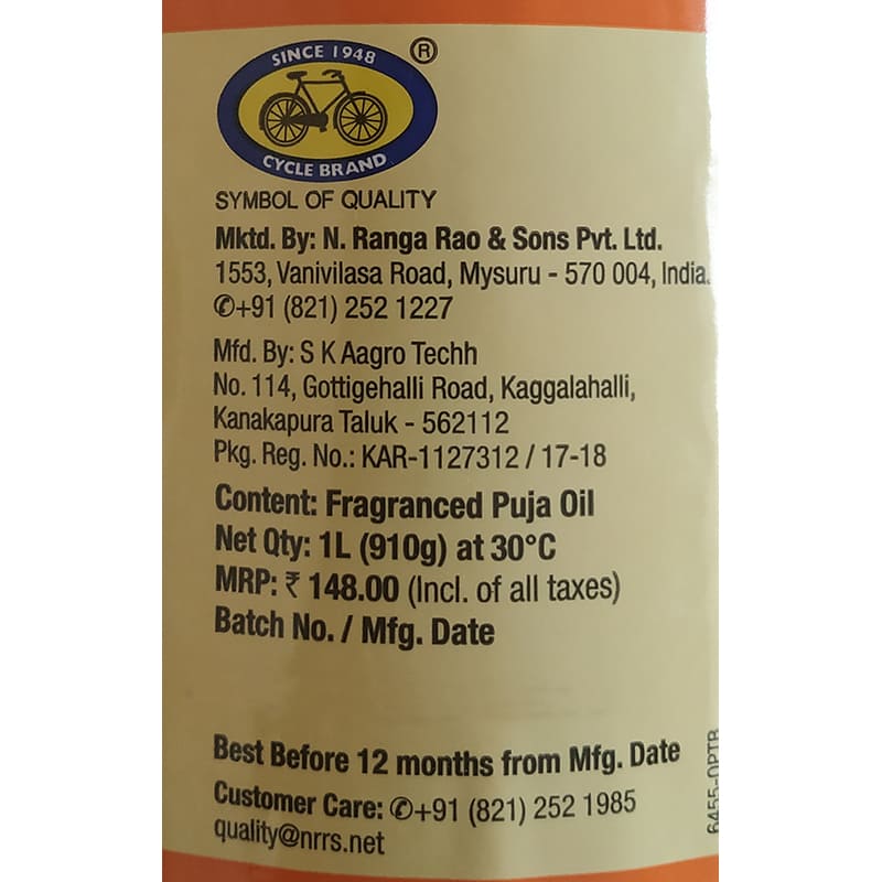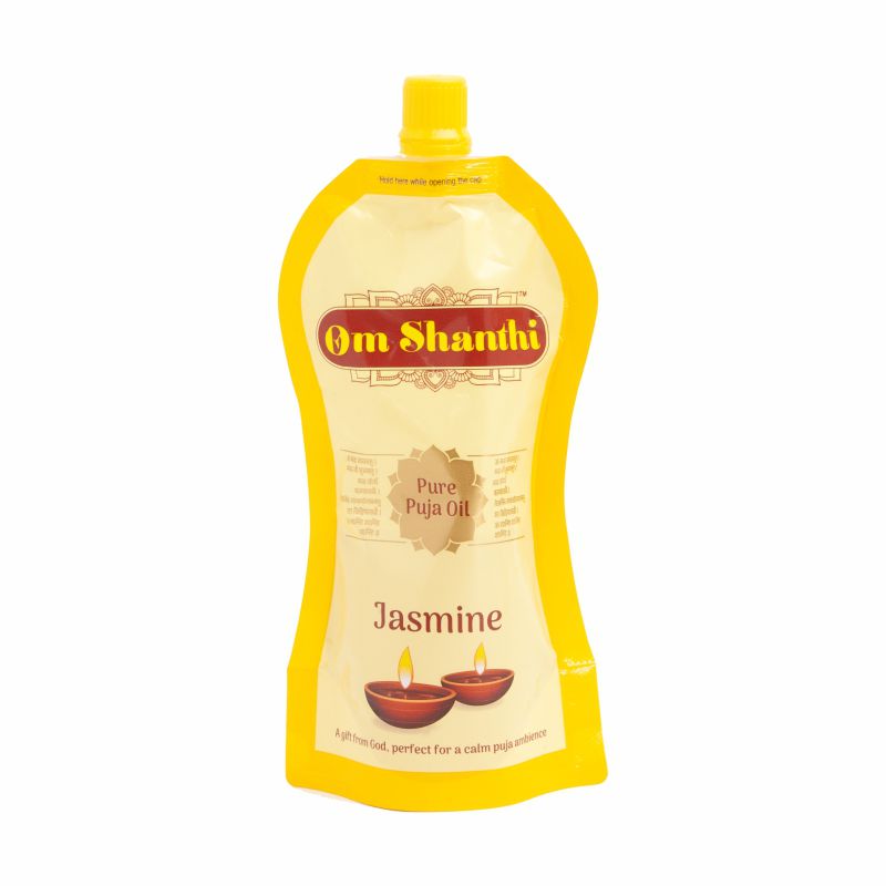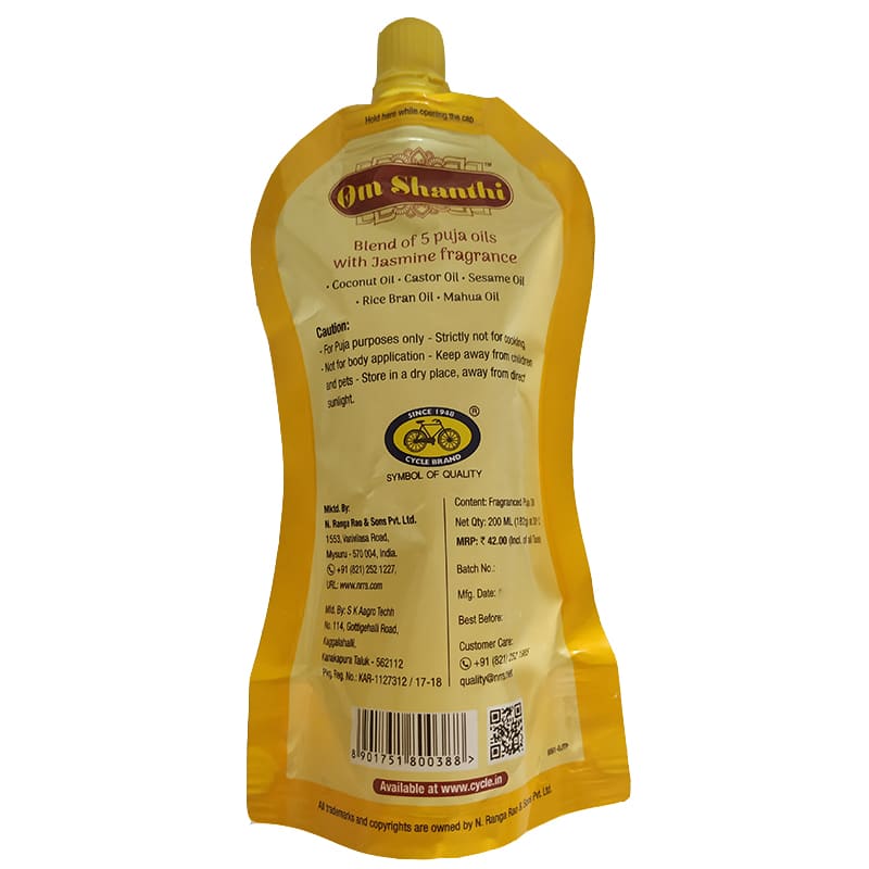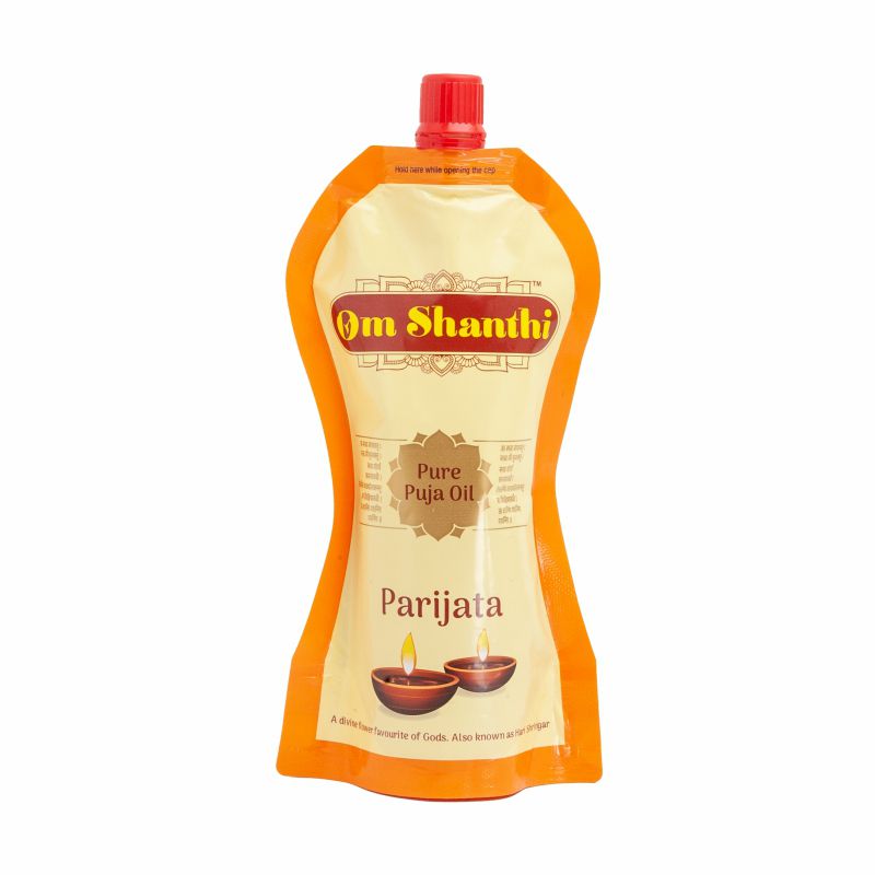 Om Shanthi Pure Puja Oil the blend of five puja oils, coconut, Rice Bran, Sesame (Til), Castor and Mahua are sourced in their purest form and blended with Jasmine/ Parijata fragrance for cherished memories to last longer.