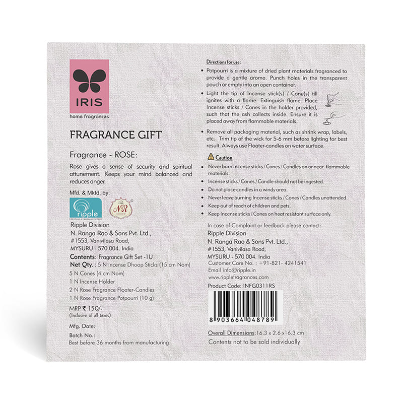 Pack Contents5 Nos Incense Dhoop Sticks, 5 Nos Incense Cones, 1 No. Incense Holder, 2 Nos Rose Fragrance Floater Candles, 1 No. Rose Fragrance Potpourri (10g)